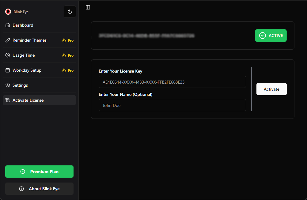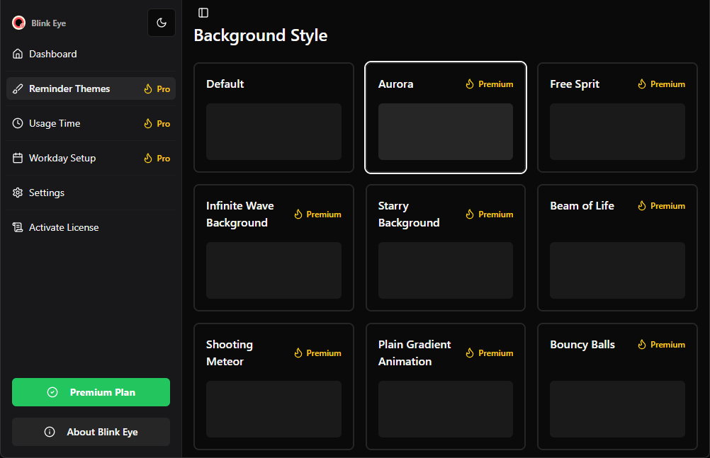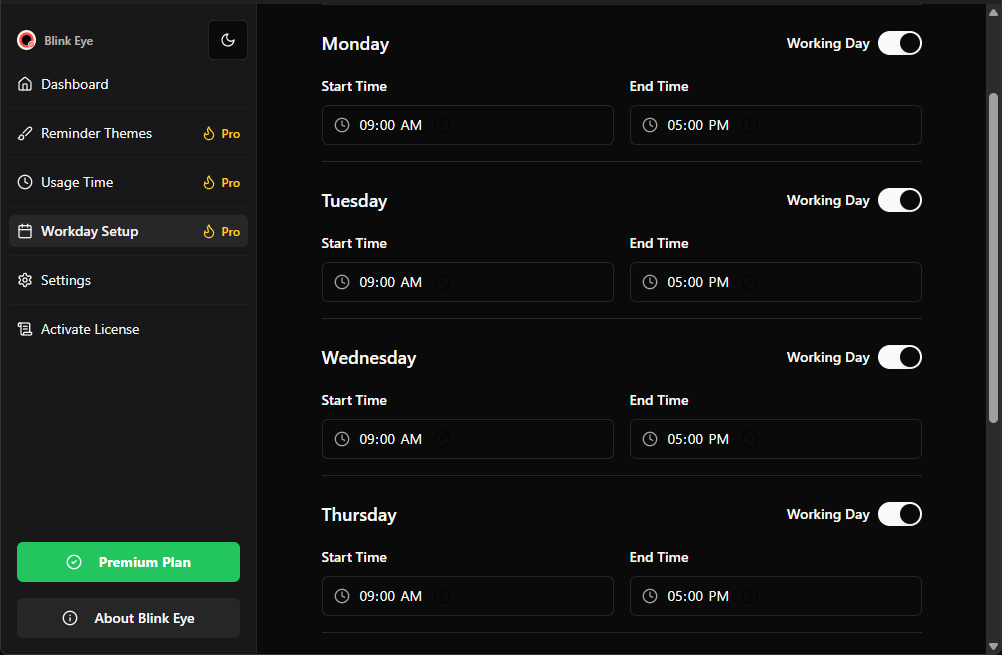 Blink Eye offers a flexible pricing model to suit all users. Basic features are completely free, but if you’d like to unlock premium features such as advanced customization, usage tracking, and workday setups, you can purchase a license key. You can also enjoy all premium features with a 7-day free trial.