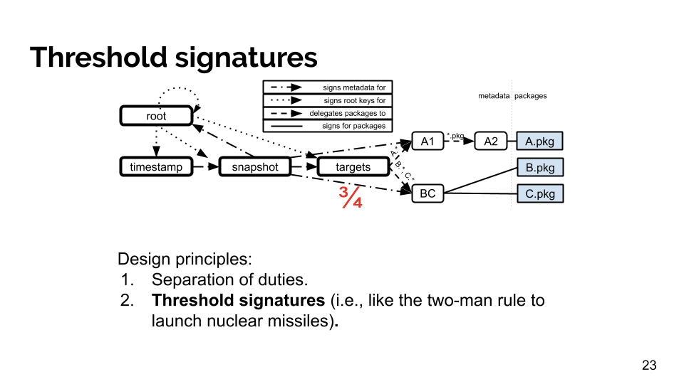 The second principle is allowing for threshold signatures, or m out of n keys, to sign any piece of metadata. This is so that a compromise of less than m keys is insufficient to cause false metadata to be signed.