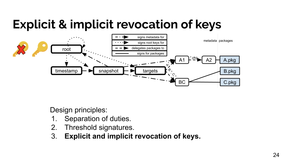 The fourth principle is building key rotation and revocation into the system. Keys will inevitably be lost or somehow compromised (e.g., reverse-engineered or stolen), and so there needs to be a way to revoke these keys and replace them with new ones. There are two ways to revoke keys in TUF: explicitly (using old keys to sign for new keys in new pieces of metadata) and implicitly (setting expiration timestamps on pieces of metadata so that keys are not necessarily trusted indefinitely).