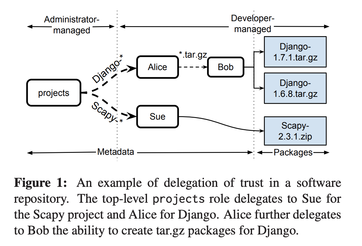 Django-*) to the public keys belonging to the developer Alice. Similarly, the Scapy project has been delegated to Sue. A delegation is simply a trusted map of which developer keys are responsible for signing which projects (or sets of packages). Based on this delegation, users would trust only Alice’s signature on a Django package. Developers can further delegate entrusted packages to other developers. In this case, Alice has delegated some packages (any package matching the pathDjango-*.tar.gz) to the developer Bob. Thus, Bob speaks for Alice for only theDjango-*.tar.gzpackages, whereas Alice’s signature onDjango-1.7.1.exe(not shown) would be trusted instead of Bob’s.Although Notary v1 has implemented some notion of delegations, it has unfortunately not implemented it in a way that matches the TUF semantics. The semantics of delegations in Notary v1 is not rich enough to capture the semantics of delegations in TUF which are needed for some security use cases, such as the one needed for CNAB. In particular, we will need both: