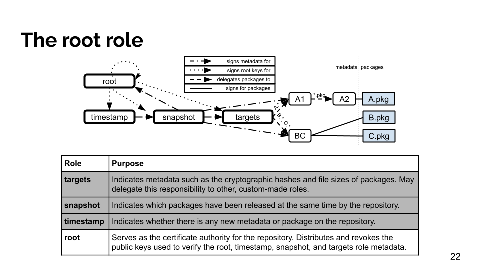 The first principle is the separation of duties, or using different sets of keys to sign different sets of metadata. The notion of a role, whether man or machine, is used to distinguish between different sets of keys. This ensures that a compromise of a set of keys belonging to any one role is generally insufficient to compromise the security of the entire system.