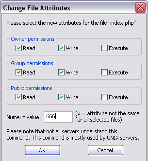 Right-click 'index.php' and select 'File Permissions' A popup screen will appear.