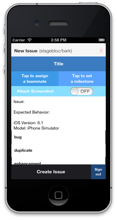 BARK (Better App Reporting Kit) is a simple, in-app issue reporting library for iOS. Shaking the app pulls up an action sheet, where beta users can instantly send email or create GitHub issues - with screenshots automatically attached.