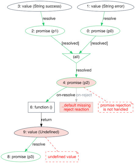 Recently, promises were added to ECMAScript 6, the JavaScript standard, in order to provide better support for the asynchrony that arises in user interfaces, network communication, and non-blocking I/O. Using promises, programmers can avoid common pitfalls of event-driven programming such as event races and the deeply nested counterintuitive control flow referred to as “callback hell”. Unfortunately, promises have complex semantics and the intricate control– and data-flow present in promise-based code hinders program comprehension and can easily lead to bugs. The promise graph was proposed as a graphical aid for understanding and debugging promise-based code.