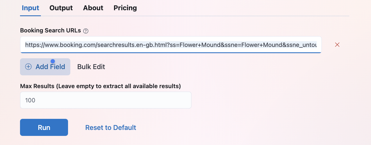 Our scraper is optimized specifically for Booking.com hotel data. If your use case requires data from other platforms like Airbnb, Expedia, Hotels.com, or vacation rental sites, please get in touch with us on WhatsApp.