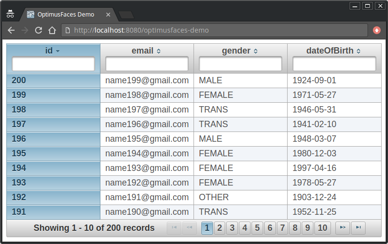 Here's how it looks like with default PrimeFaces UI and all. This example uses exactly the above Java and XHTML code with a Person entity with Long id, String email, Gender gender and LocalDate dateOfBirth fields.