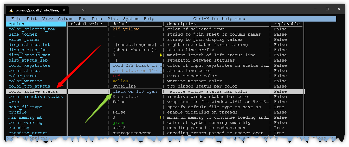 ~/.visidatarcoptions.color_status = 'bold black on 255', e salvi quel file.Così è diventata globale e sarà sempre valida