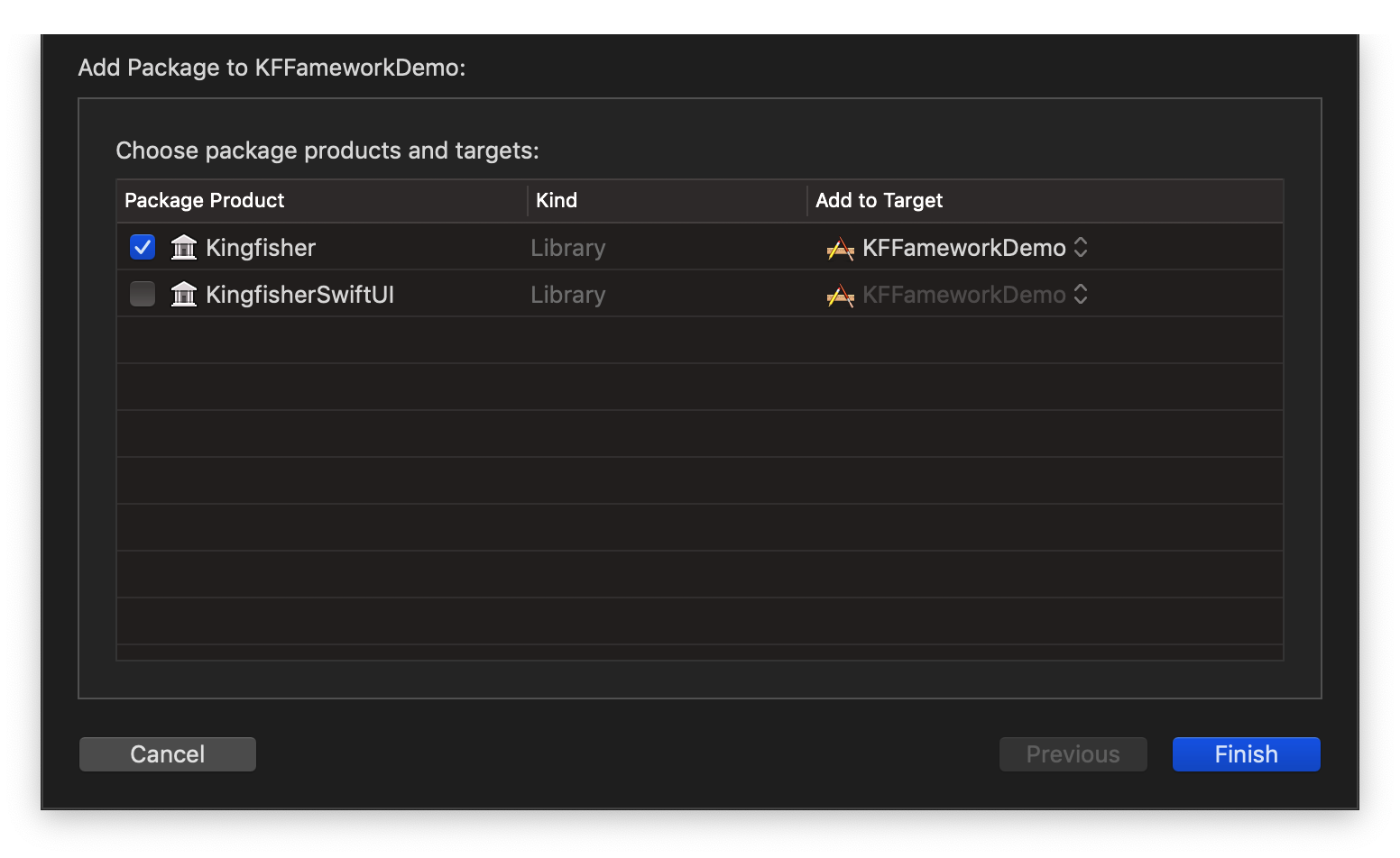 - After Xcode checking out the source and resolving the version, you can add the "Kingfisher" library and add it to your app target.