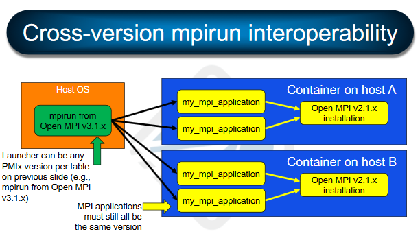 Yeah, it's a little complicated. Even though PMIx might interoperate, the problem is that there is no guarantee that the information being communicated is the same. IIRC, what we say is that we guarantee interoperation if the major is the same, and it might work if the major is different - but we cannot guarantee it. I could be confused myself, so maybe @bwbarrett or @jsquyres should chime in. All I can say for certain is that the PMIx communication channel will work in that slide - I just can't guarantee the contents of that communication will meet all expectations/requirements. |