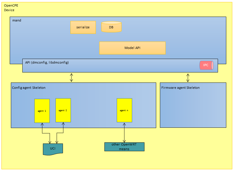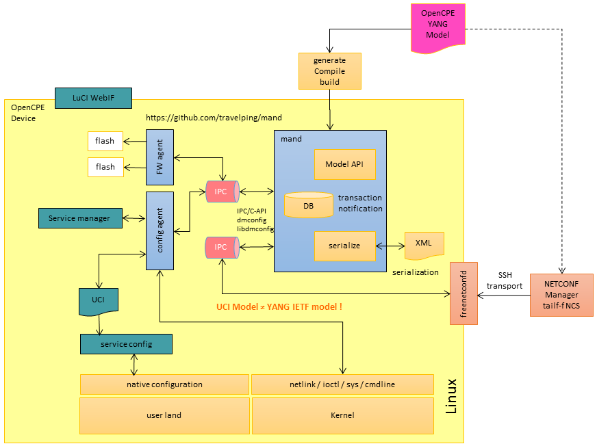 The OpenCPE projects aims to provide NETCONF support in a non-intrusive way. It therefore does not replace OpenWRT UCI framework, but builds on top it. NETCONF support consists of tree main parts: