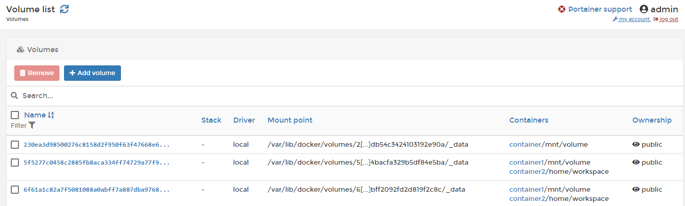 I have to click on each volume to figure out which container and on which mount is bound to the volumes.