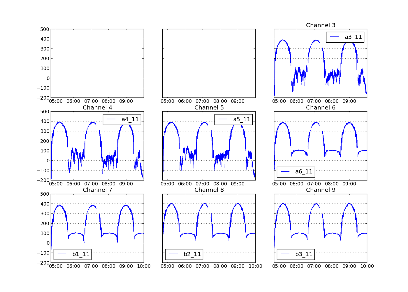 - The last major x-ticklabel of the last row of axes is 10:00, while for the first 2 rows it is 9:00. I confirmed that all columns have data in the last row (index = 2011-04-02 10:00:00.718000) and not NaN which would have been excluded in the plot, potentially.