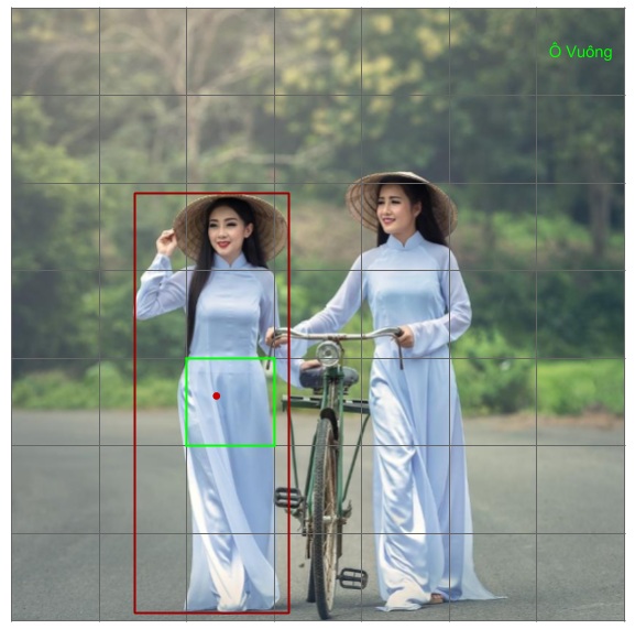 - Đối tượng duy nhất mà ô vuông đó chứa. Tâm của đối tượng cần xác định nằm trong ô vuông nào thì ô vuông đó chứa đối tượng đó. Ví dụ tâm của cô gái nằm trong ô vuông màu xanh, do đó mô hình phải dự đoán được nhãn của ô vuông đó là cô gái. Lưu ý, cho dù phần ảnh cô gái có nằm ở ô vuông khác mà tâm không thuộc ô vuông đó thì vẫn không tính là chứa cô gái, ngoài ra, nếu có nhiều tâm nằm trong một ô vuông thì chúng ta vẫn chỉ gán một nhãn cho ô vuông đó thôi. Chính ràng buột mỗi ô vuông chỉ chứa một đối tượng là nhược điểm của mô hình này. Nó làm cho ta không thể detect những object có tầm nằm cùng một ô vuông. Tuy nhiên chúng ta có thể tăng grid size từ 7x7 lên kích thước lớn hơn để có thể detect được nhiều object hơn. Ngoài ra, kích thước của ảnh đầu vào phải là bội số của grid size.