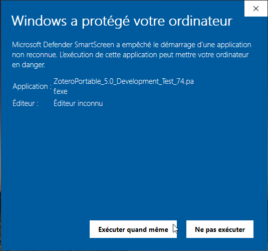 However, some organizations block this workaround (see #20 for more info). If you still want to use ZoteroPortable, one solution is to check "unblock" option in the file properties: see this comment from AndhikaWB.