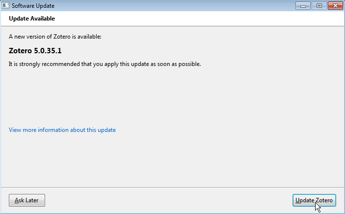 - Click on Update Zotero, wait for download.