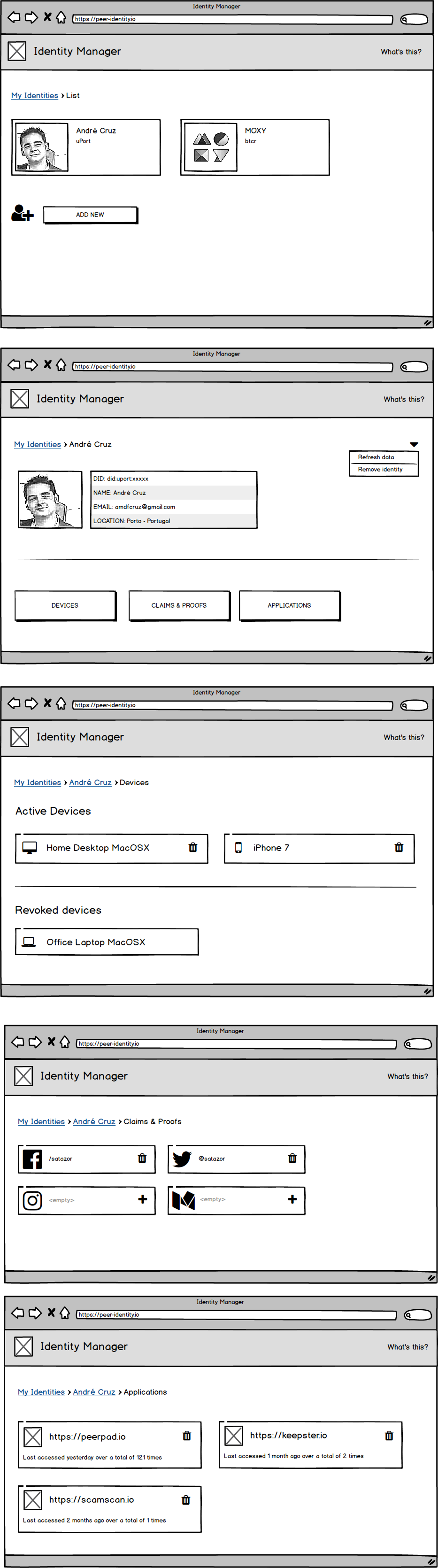 The IdentityManager is a web-page hosted on IPFS and reachable via a specific URL, e.g.: https://peer-identity.io. The application will work completely offline thanks to the installation of a ServiceWorker.