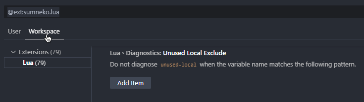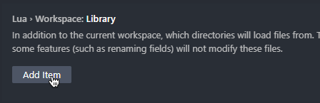 Lastly, we need to add the Photon 2 directory into the project's workspace library so Photon 2's code can be read by the extension and provide useful hints. Find the section labeled "Lua > Workspace: Library," and click the "Add Item" button.