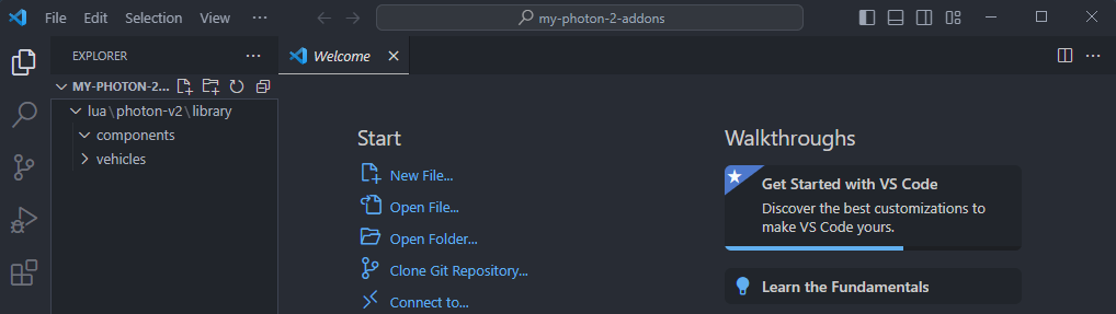 Once you have the initial folders setup, we will open our new custom addon folder as a project inside VSCode (if you're not using VSCode, most editors work in a similar manner).