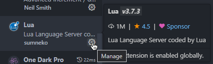Next, locate the Sumneko Lua extension entry in the list (if you just installed VSCode, it's probably at the top). Then click the Manage gear icon on the bottom right of the entry.