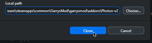 Set the Local Path to the location of your Garry's Mod addons folder ...\steamapps\common\GarrysMod\garrysmod\addons\. (If you are unsure where this is, the default location on Windows is C:\Program Files (x86)\Steam). At the end of addons\ ensure it says Photon-v2, which is the final destination folder.