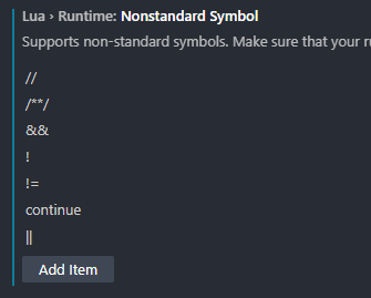 To configure the extension to be compatible with Garry's Mod's Lua tweaks, we need to add a few "nonstandard symbols," which are special keywords and syntax options that Garry's Mod's Lua supports but aren't natively supported by Lua. To do so, scroll down until you locate the section that says "Lua > Runtime: Nonstandard Symbol."