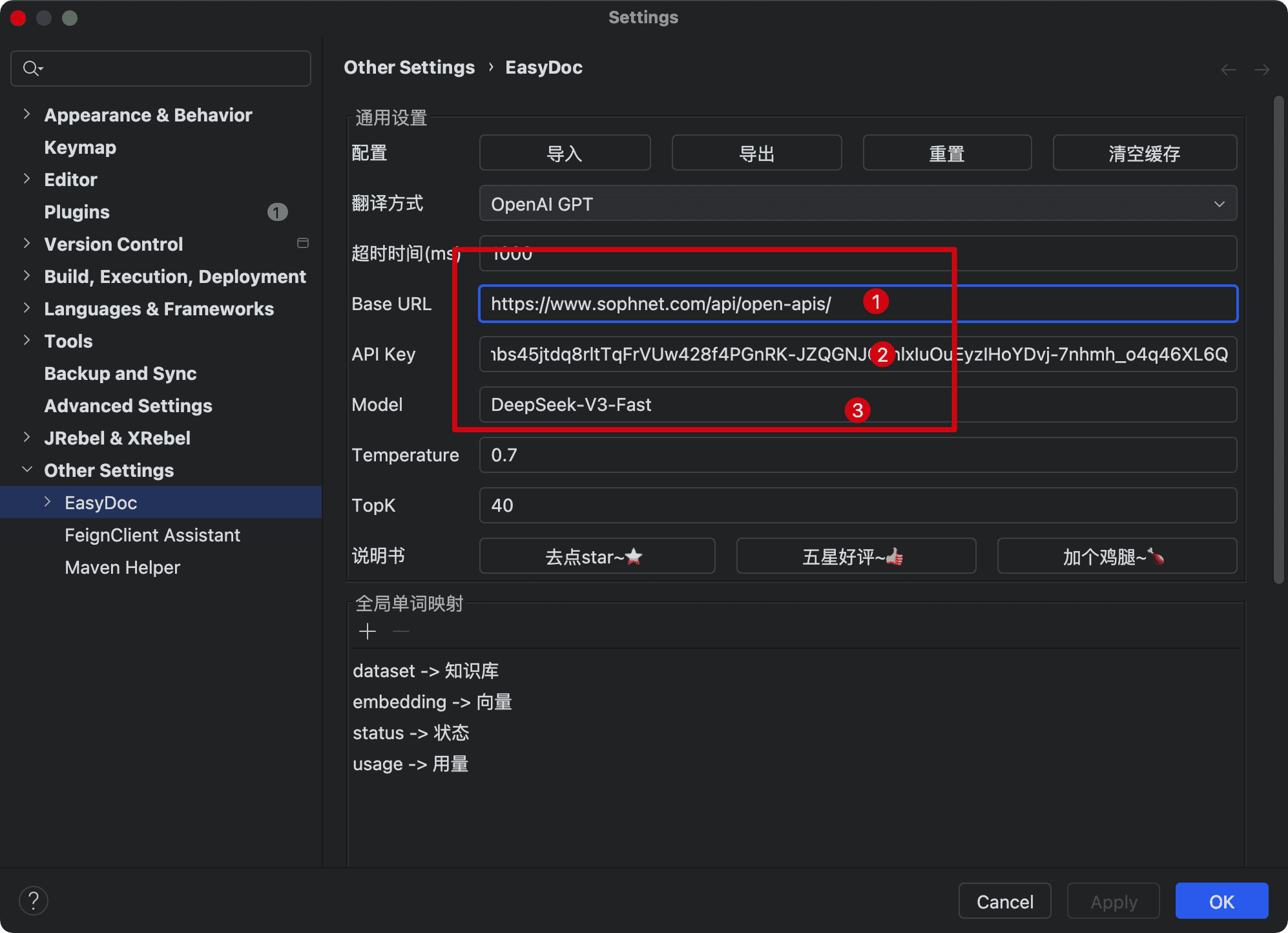 在插件设置中配置 OpenAI 接口参数: