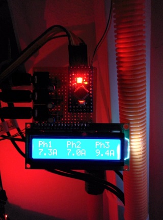 Arduino 3phase AC current monitor with 16x2 LCD display (uses EmonLib), outputs to 16x2 LCD display and serial port (if needed)
