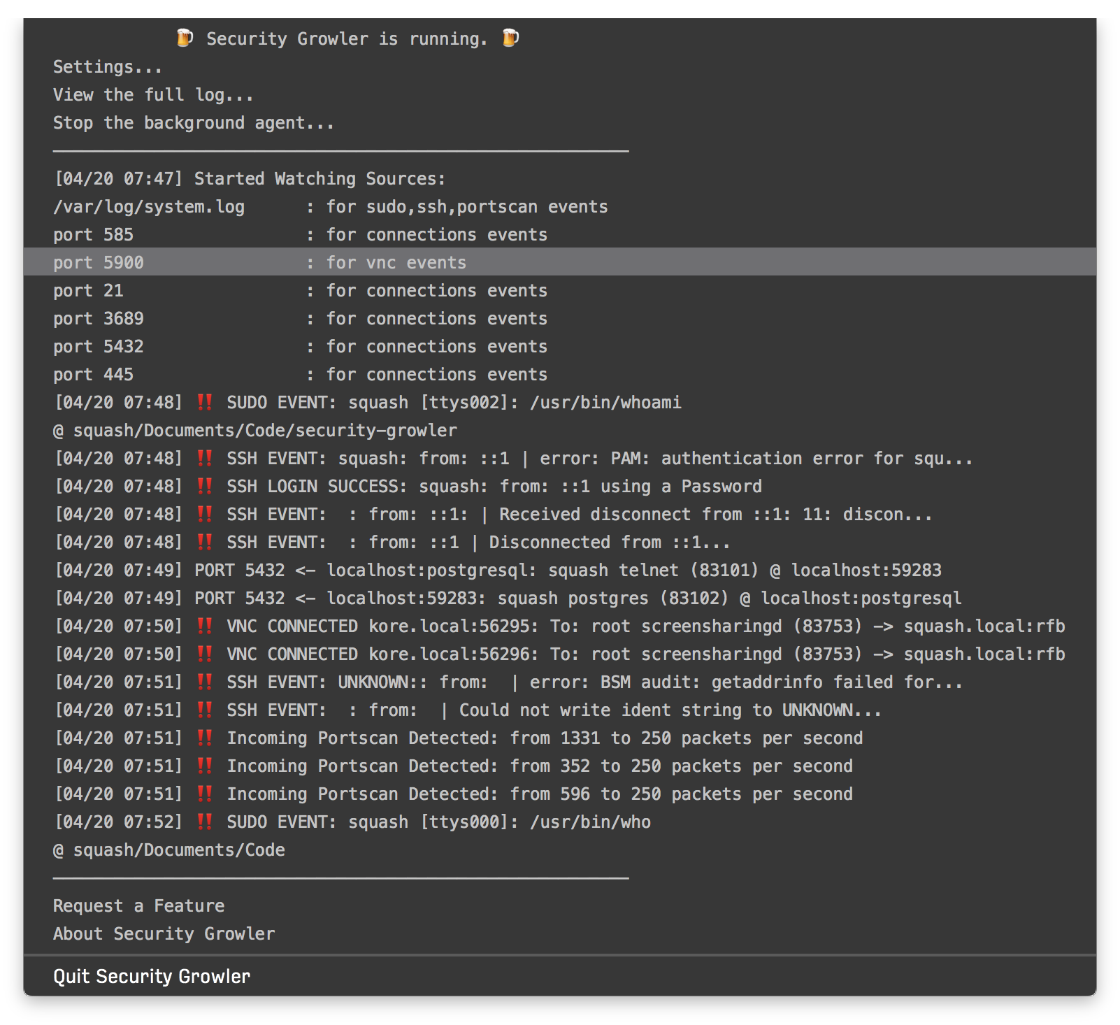 Little Snitch is still hands-down the best connection-alerting software available for Mac, I highly suggest you check it out if you want a comprehensive firewall/alerting system, and are willing to pay a few bucks to get it. Security Growler is centered around parsing logfiles for any kind of generic pattern, not just monitoring the TCP connection table like Little Snitch. For example, my app can alert you of sudo events, keychain auth events, and anything else you can think of that's reported to a logfile. This app is significantly more lightweight than Little Snitch, it comes in at <15mb of RAM used, because it aims to solve a simpler problem than Little Snitch. This app is not designed to prevent malicious connections, that's what firewalls are for, it's just meant to keep an unobtrusive log, and alert you whenever important security events are happening. The more informed you are, the better you can protect yourself.