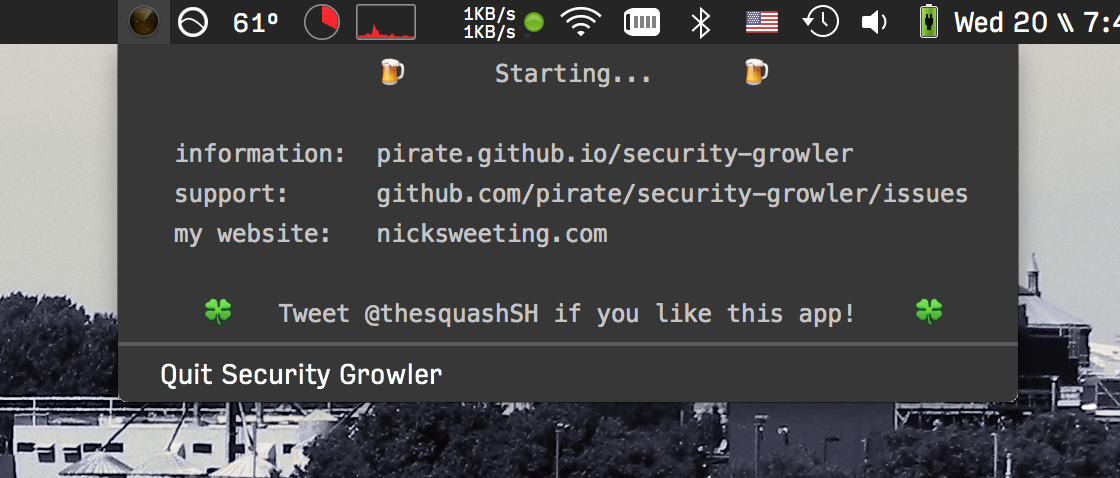security-growler.30s.pyto your SwiftBar/xbar/bitbar plugins folder:mkdir -p ~/Library/Application\ Support/xbar/plugins cd ~/Library/Application\ Support/xbar/plugins curl -sSL https://raw.githubusercontent.com/pirate/security-growler/refs/heads/master/security-growler.30s.py > security-growler.30s.py chmod +x security-growler.30s.py