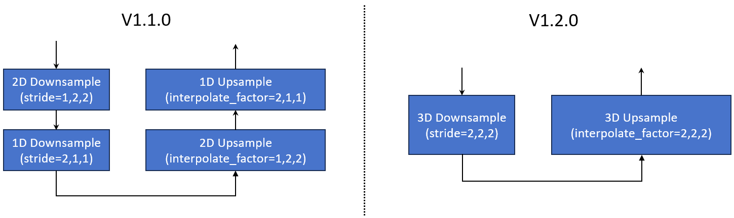 The VAE in version 1.2.0 maintains the overall architecture of the previous version but merges the temporal and spatial downsampling layers. In version 1.1.0, we performed spatial downsampling (stride=1,2,2) followed by temporal downsampling (stride=2,1,1). In version 1.2.0, we conduct both spatial and temporal downsampling simultaneously (stride=2,2,2) and perform spatial-temporal upsampling in the decoder (interpolate_factor=2,2,2).