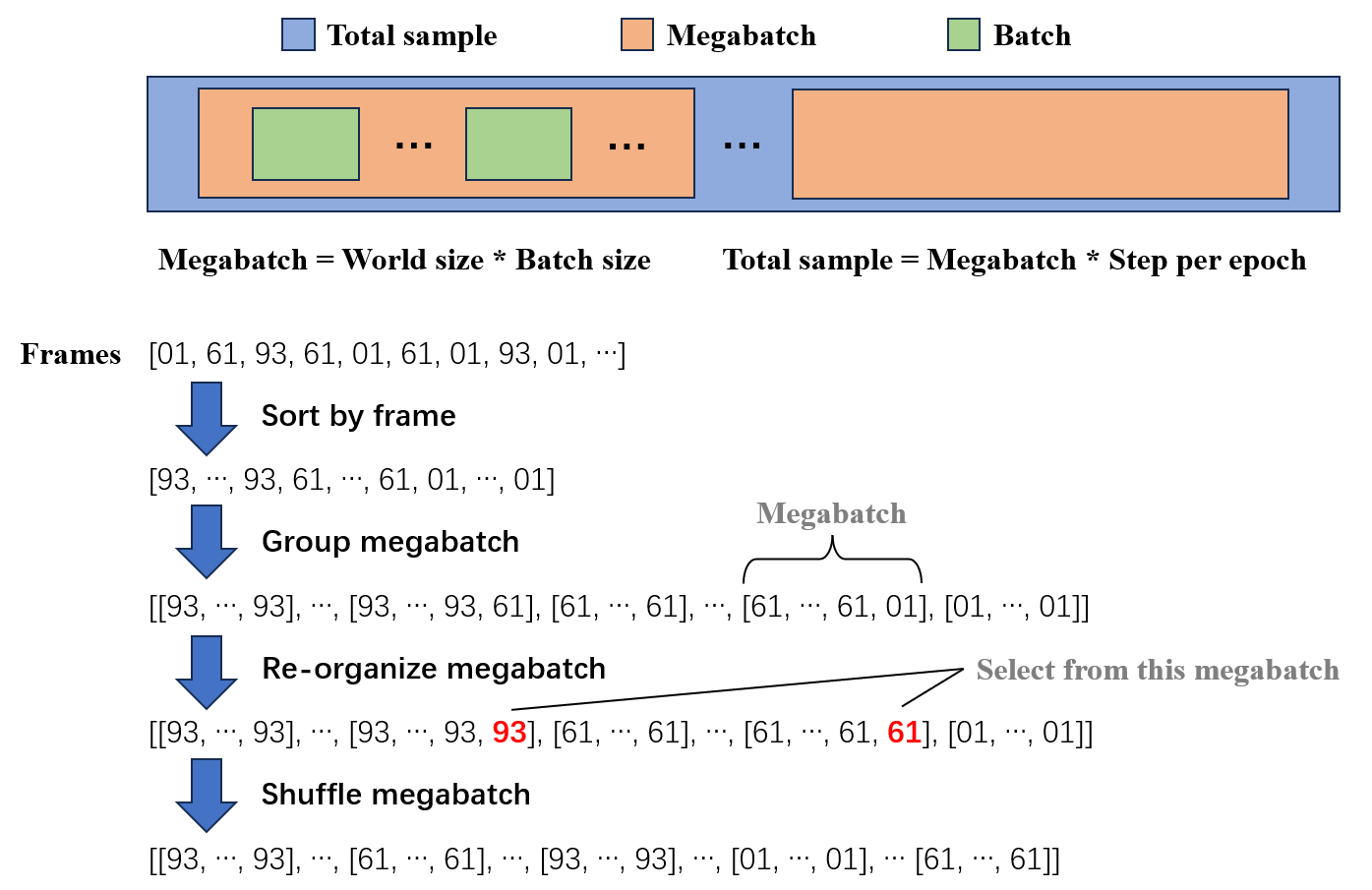 Group megabatch: Next, all data is divided into groups, each forming a megabatch. Since all data is pre-sorted, most videos within a megabatch have the same number of frames. However, there will always be boundary cases, such as having both 61-frame and 1-frame videos in a single megabatch.