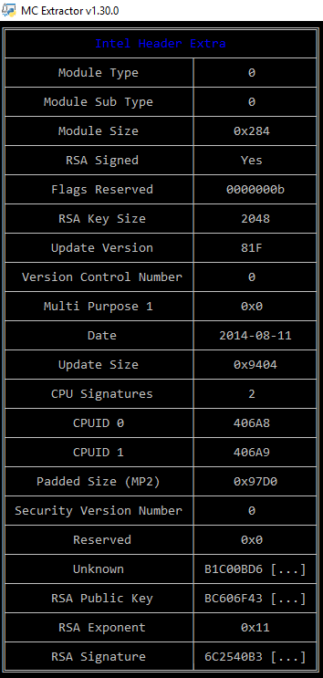 The next 8 entries (0x90-0xB0, Unknown) seem to hold some sort of 32-byte value, maybe a 256-bit hash, but I have not been able to determine for what data. It seems it is neither affected by the Main Header nor by the (also encrypted) alignment/garbage padding. The latter is proven by various identical microcodes, when it comes to Patch data, which target different Platforms and end with different padding after the Update Size (10th entry) but have the same Unknown value. However, by comparing multiple microcodes, field Unknown is definitely related to the RSA block (Public Key, Exponent, Signature). Various checks were performed but Unknown does not seem to be directly related to the RSA Public Key & Exponent, even if it could be a good candidate for their combined hash, maybe used as part of the data of the 160/256-bit hash protected by the RSA Signature.