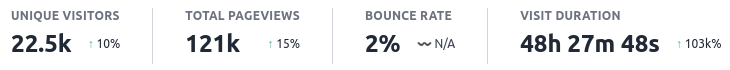 Looks weird @joseika! (you also have a very very low bounce rate) And thanks for reporting this! Would you be able to reach out to us with more details so we can take a look at your site and see what we can find out? https://plausible.io/contact . Obviously you can also post here if you don't mind sharing your site URL. Thanks |