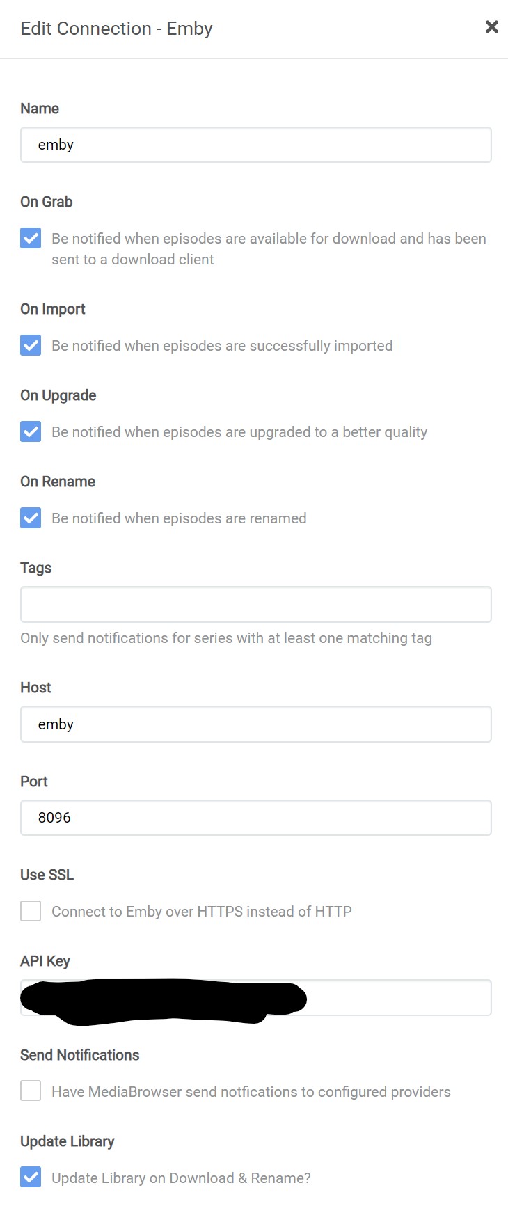After selecting the indexer, the only thing that has to be done is add the API Key. Indexers provide API keys outright or buried within the settings of their website. Ensure that the key is not known or shared to others. Some indexers may ban the use of your key if excessive IP address are detected.