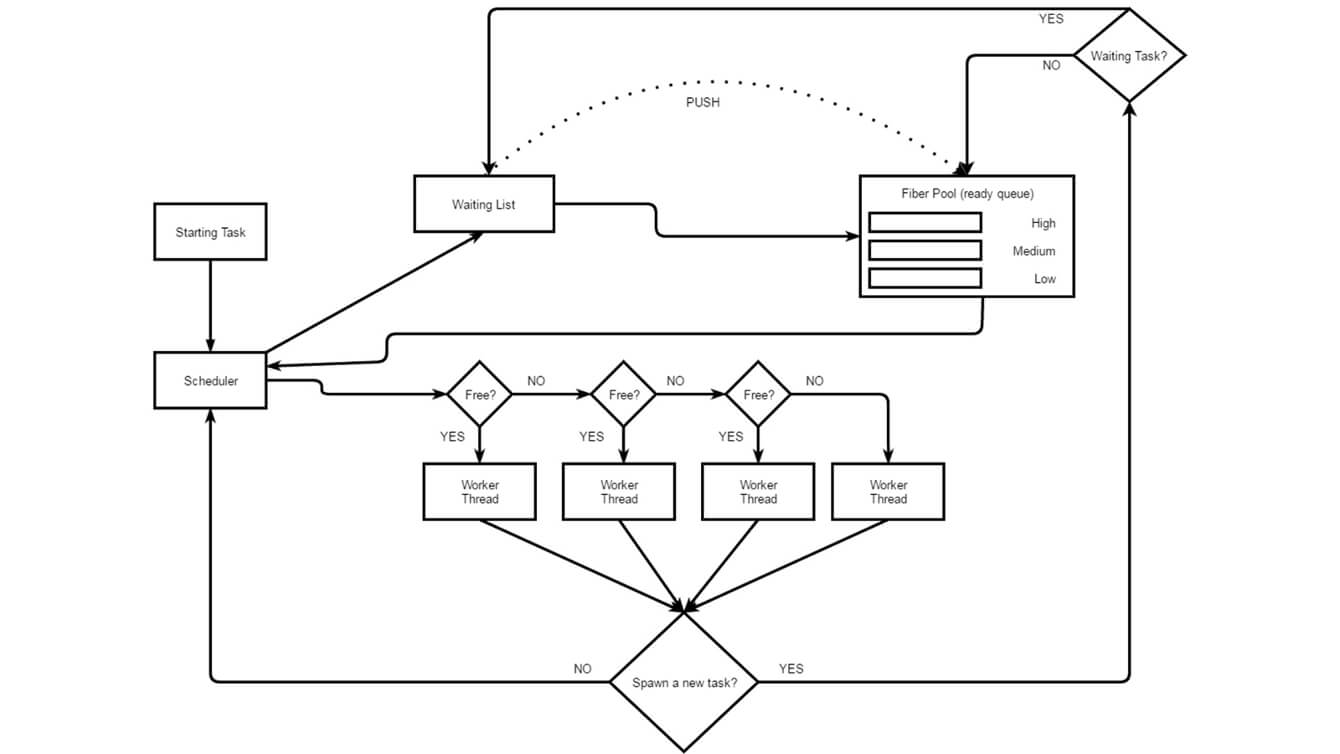 Scheduler::wakeUpMain(); - When constructed, the scheduler will create several worker threads which will be ready to execute tasks
