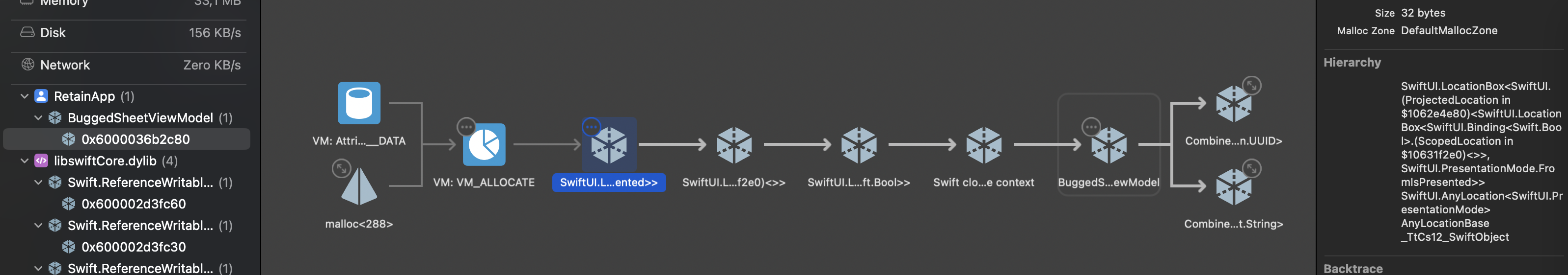 Hi @timbueno, it's worth mentioning that this isn't really a retain cycle or even a memory leak, but more of a delayed release. If you re-open the sheet you will see that the previous model object is released. It's also worth mentioning that this is reproducible in vanilla SwiftUI. I don't have the code sample immediately available right now, but we found that binding transformation methods seem to cause the issue for some reason. I will try to post a repro later. |