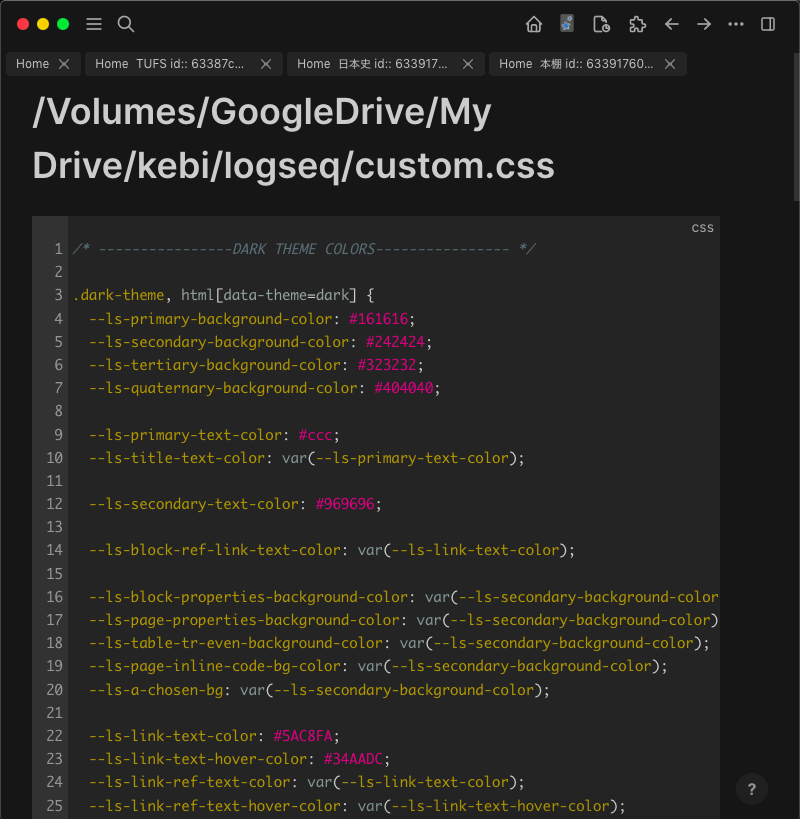 Enjoy stock Logseq with dark colors. This theme doesn't modify margin, padding or other properties that might brake future compatibility. Check the CSS file comments to see what has been changed. Based on https://github.com/playerofgames/logseq-mia-theme https://github.com/Sansui233/logseq-bonofix-theme
