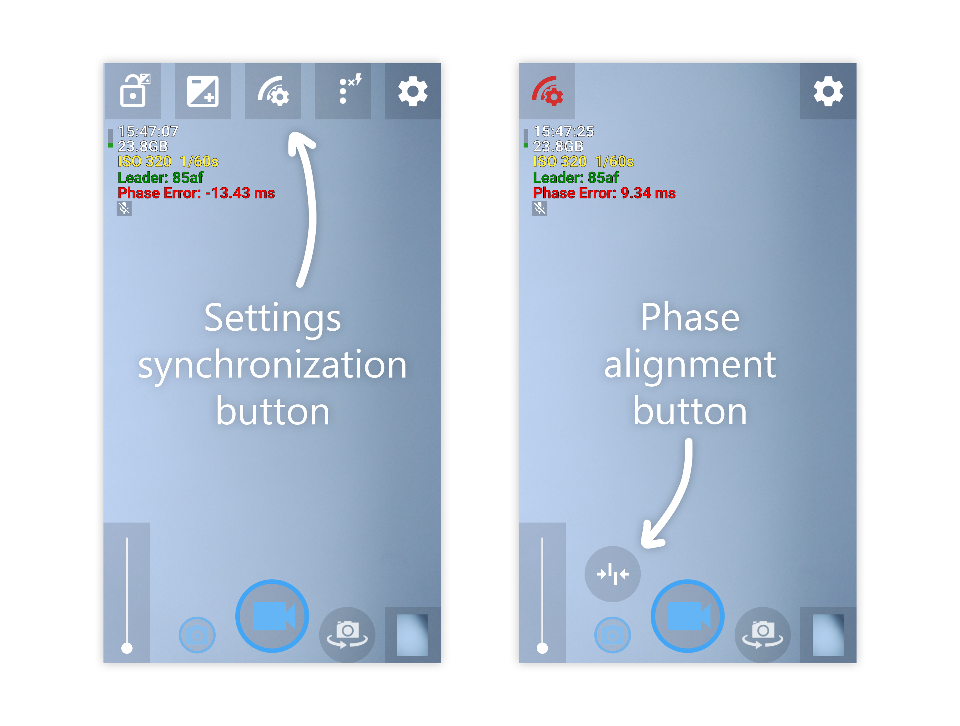 - Switch to video, adjust the camera settings as needed and press the settings synchronization button