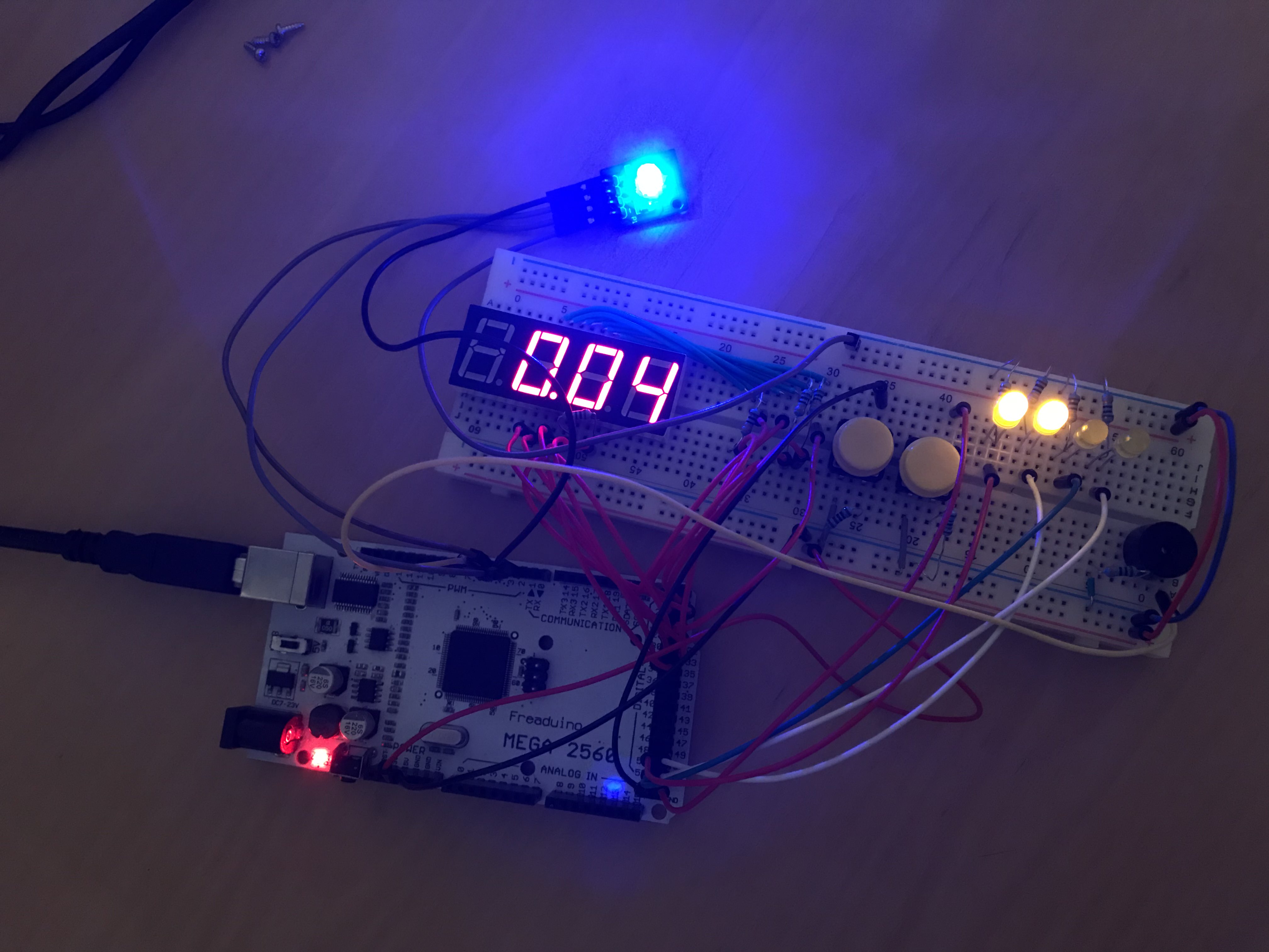 Work periods begin paused. The timer may be (un)paused with the left push button. If one of [1, N)th work periods completes, a short break begins. If the Nth work period completes, a long break begins. In this case, N is 4.