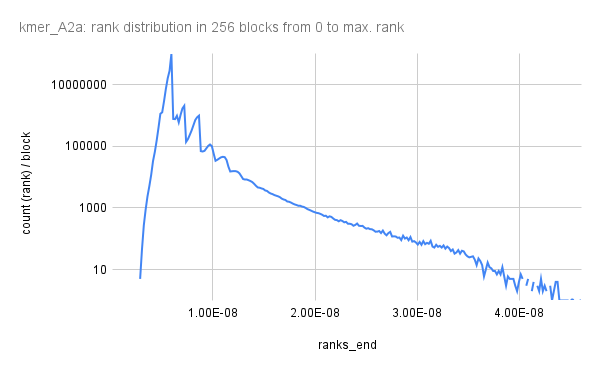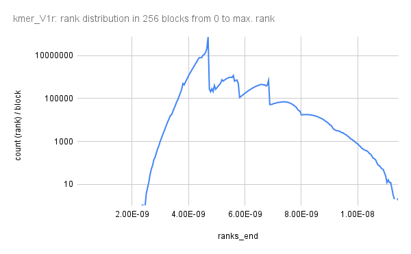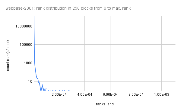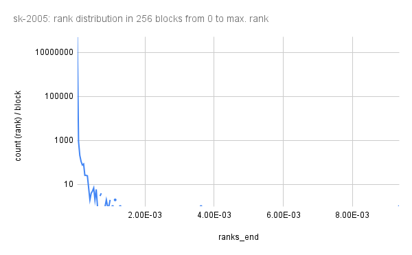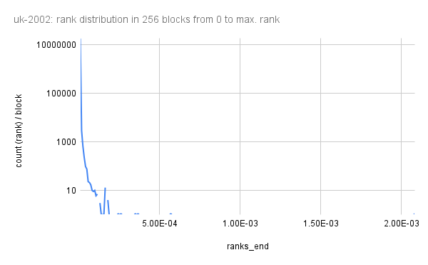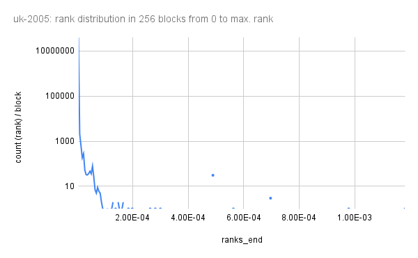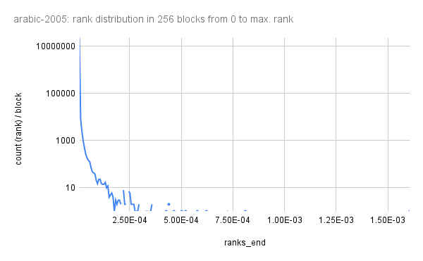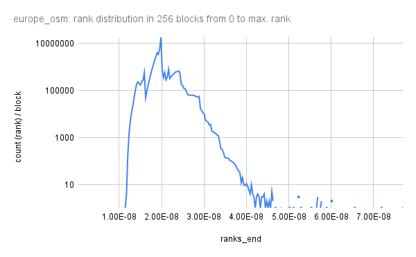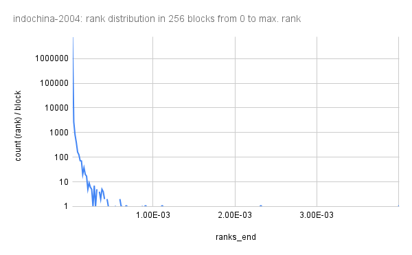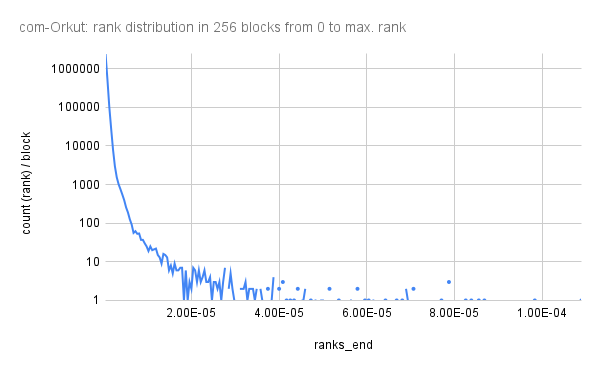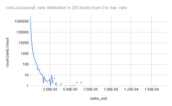 The PageRank distribution is however completely different in road networks and protein k-mer graphs. Here, we appear to be forming mountain ranges, with sharp peaks, steep slopes on the left side, and a long tail on the right side. This likely due to such real-world graphs being undirected (along with social networks), as well as being unformly connected overall (in contrast to digital-world web graphs). Does this mean that digital networks exaggerate the rich vs poor divide?