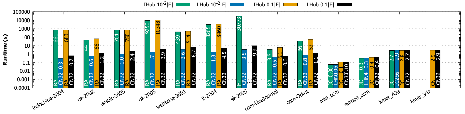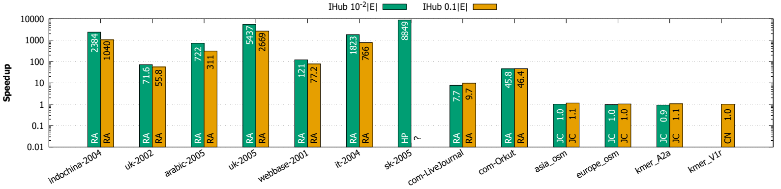 Below we plot the speedup of LHub wrt IHub, on 13 different graphs, with 10^-2|E| and 0.1|E| unobserved edges. LHub surpasses IHub by, on average, 1622× and 415×, on 10^-2|E| and 0.1|E| unobserved edges respectively. Further, on the sk-2005 graph with 0.1|E| edges removed, LHub achieves a link prediction rate of 38.1M edges/s.