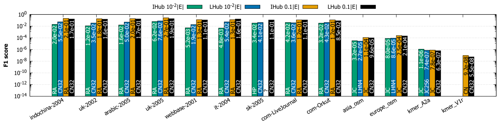 Finally, we plot the F1 score for links predicted with the IHub and LHub approaches. The IHub approach achieves an average F1 score of 1.8×10^−2 and 1.1×10^−1 when predicting 10^−2|E| and 0.1|E| edges, respectively. In comparison, the LHub approach achieves F1 scores, averaging 3.2×10^−2 and 9.8×10^−2 , respectively. Thus, the LHub approach predicts links with similar F1 scores, while being significantly faster than the IHub approach.