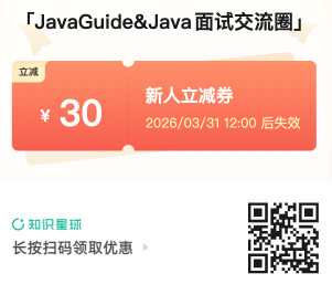 另外,这个是一年的,到明年这个时候结束,差不过够用了。如果服务结束的时候你还需要星球服务的话,可以添加我的微信(javaguide1024)领取一个续费优惠卷,半价基础再减 10,记得备注 “续费” 。