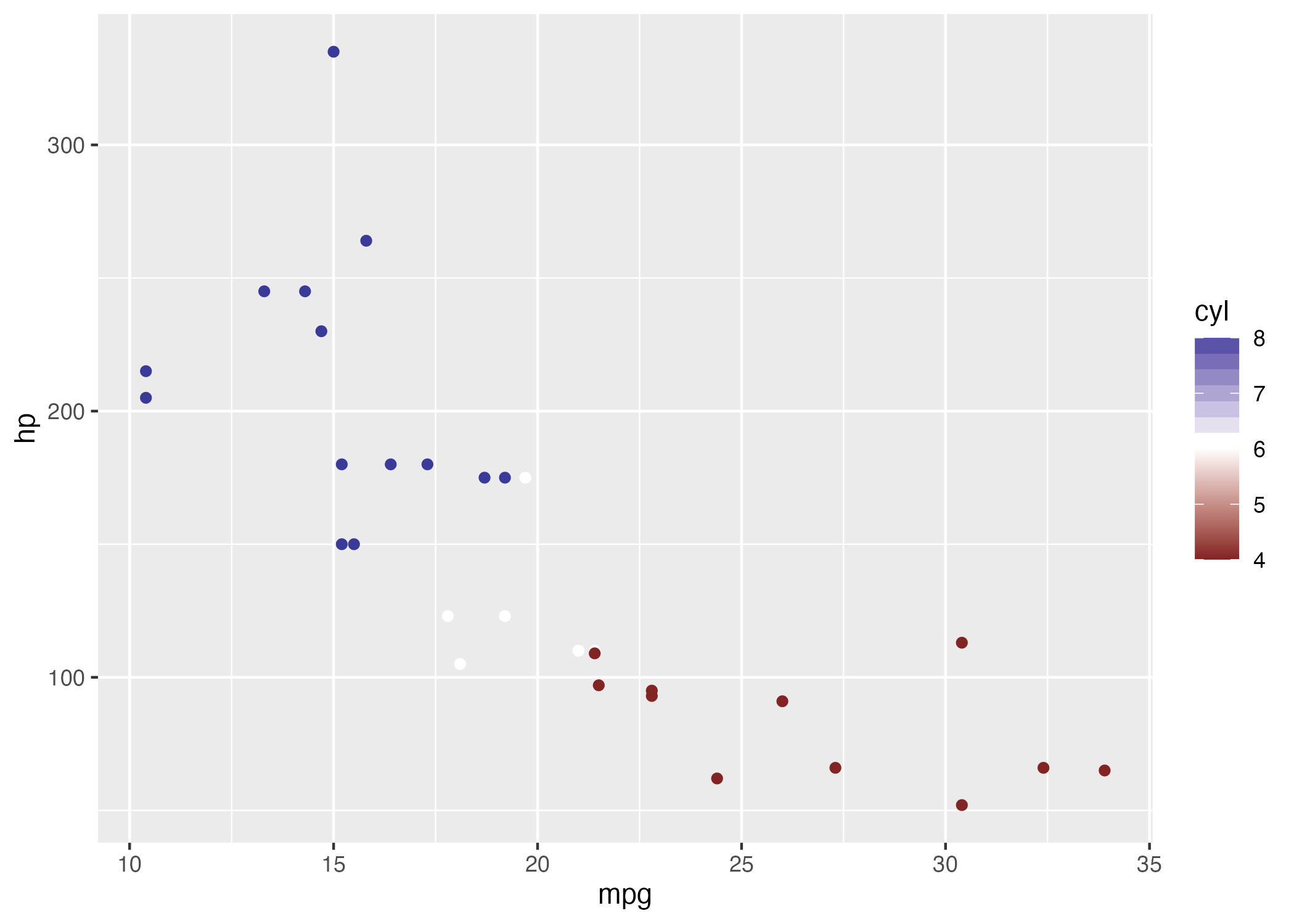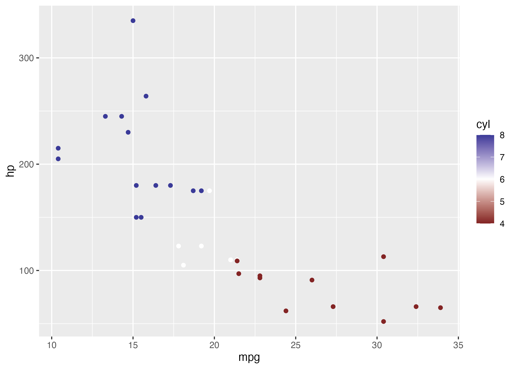 p <- ggplot(mtcars, aes(mpg, hp, color = cyl)) +