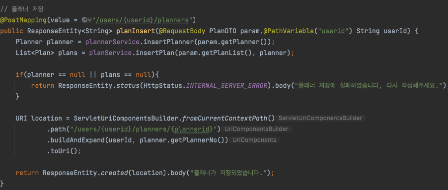 - 해결 : View를 반환하는 Controller, 데이터를 반환하는 APIController로 분리하였고 데이터 저장,수정, 삭제의 경우 클라이언트 화면에서 버튼을 누르는 등의 동작에 따라 자바스크립트로 비동기 요청을 보냈습니다. 이런 요청들에 대해 PlannerAPIController에서 가장 깔끔한 JSON 형식으로 이동할 URI와 응답 결과를 반환하였습니다.