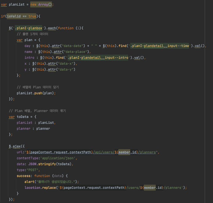 플래너 저장시 배열에 일정 관련 데이터를 넣어 json 타입으로 Controller에게 전달
