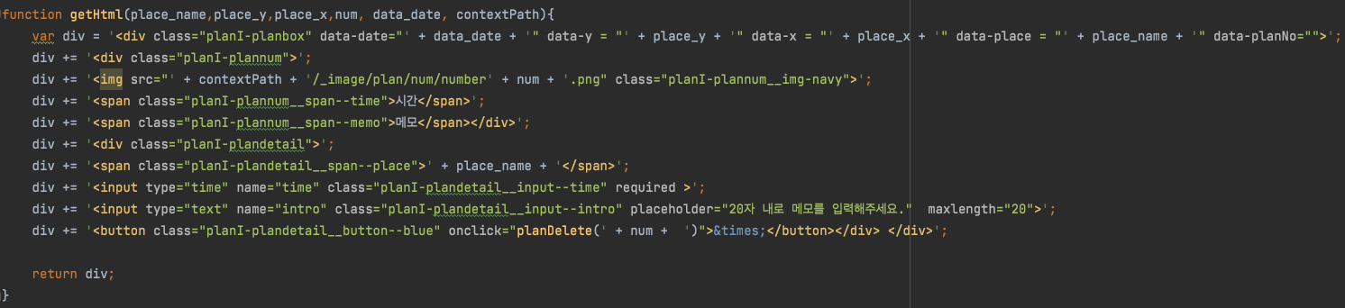 KAKAO Map API에서 조회된 데이터 기반으로 일정 추가시 일정 관련 div 생성하는 함수