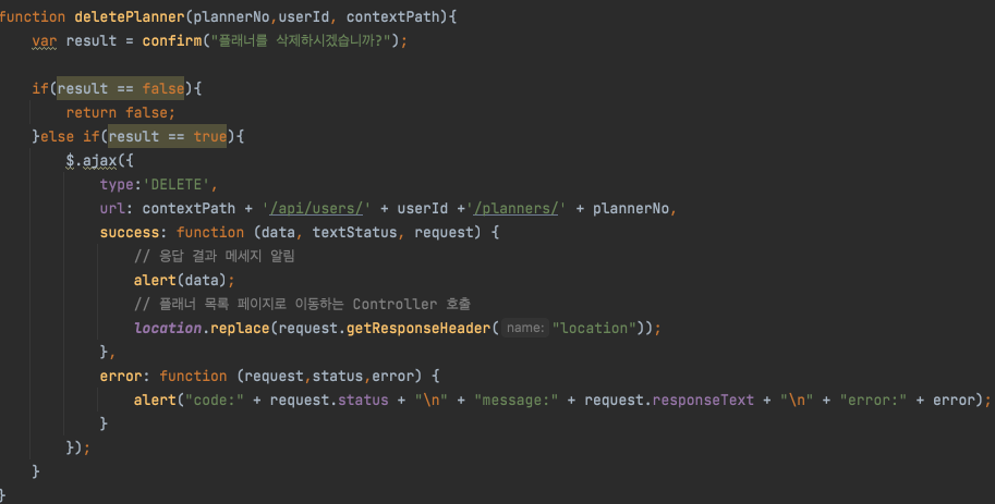 플래너 상세 페이지에서 플래너 삭제 버튼 클릭시 실행되는 자바스크립트 함수로 ajax 실행하여PlannerAPIController의 플래너 삭제 메소드 호출