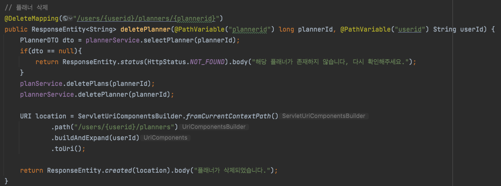 삭제할 플래너가 존재하지 않을 경우 오류 메시지와 상태 반환, 삭제가 완료되었다면 플래너 목록으로 이동하는 URI와 성공 메세지 반환