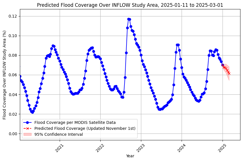 This program is a machine learning model designed to predict flood inundation coverage over the INFLOW study area. It leverages satellite data, transformer modls, and Monte Carlo simulations to generate 2-month predictions and 95% confidence intervals. It also automates the processing, normalisation, and visualisation of data, providing actionable insights into flood dynamics in the While Nile basin.